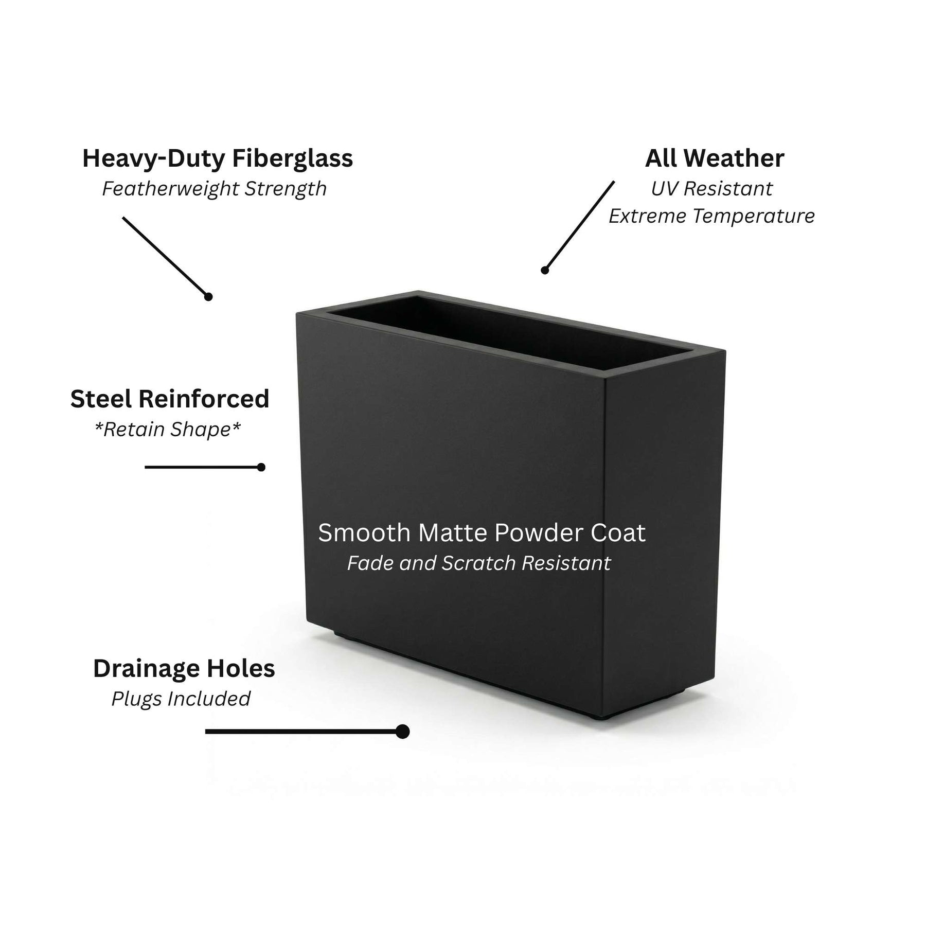 While many long planters tend to "bow" or warp over time, the Julian features a steel-reinforced fiberglass frame. This internal support ensures the walls stay perfectly straight and square, even when filled with heavy soil and water. The Matte Black finish provides a bold, neutral look that fits any design, offering the premium appearance of stone or metal without the excessive weight.